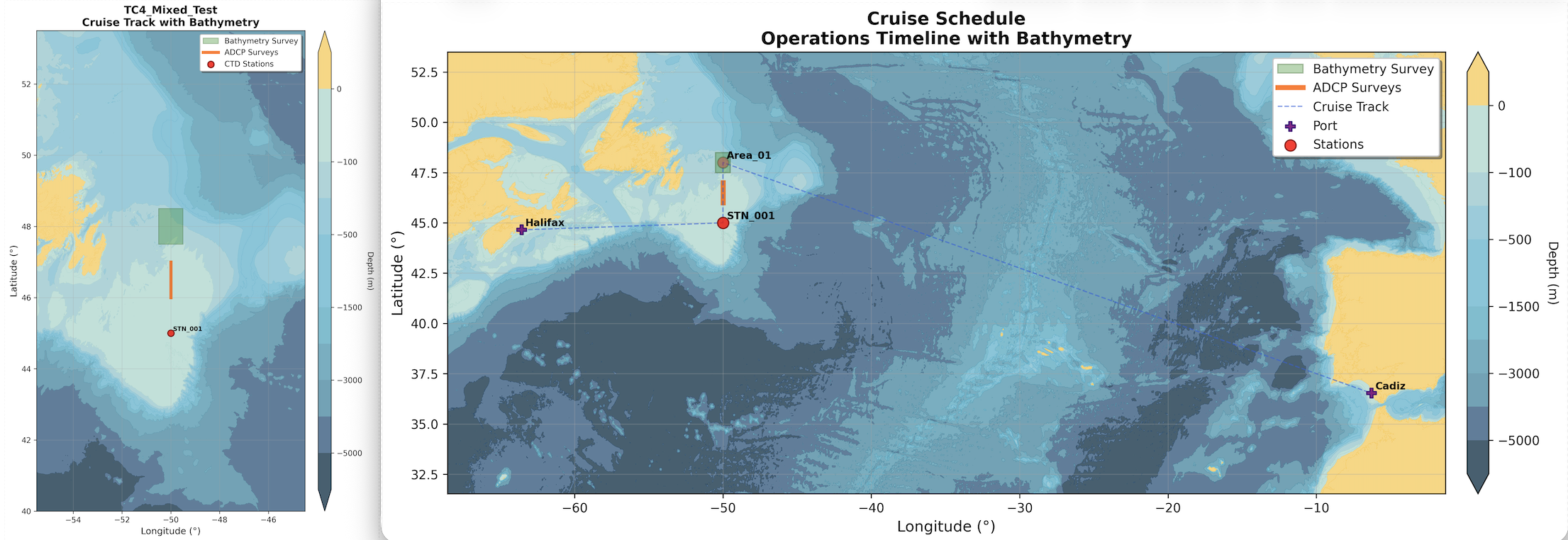 PNG Output Comparison: Left shows cruiseplan map output (configuration-based), right shows cruiseplan schedule output (timeline-based). Note the key difference: schedule output includes departure/arrival ports and lines to show transits, while map output focuses purely on station configuration.